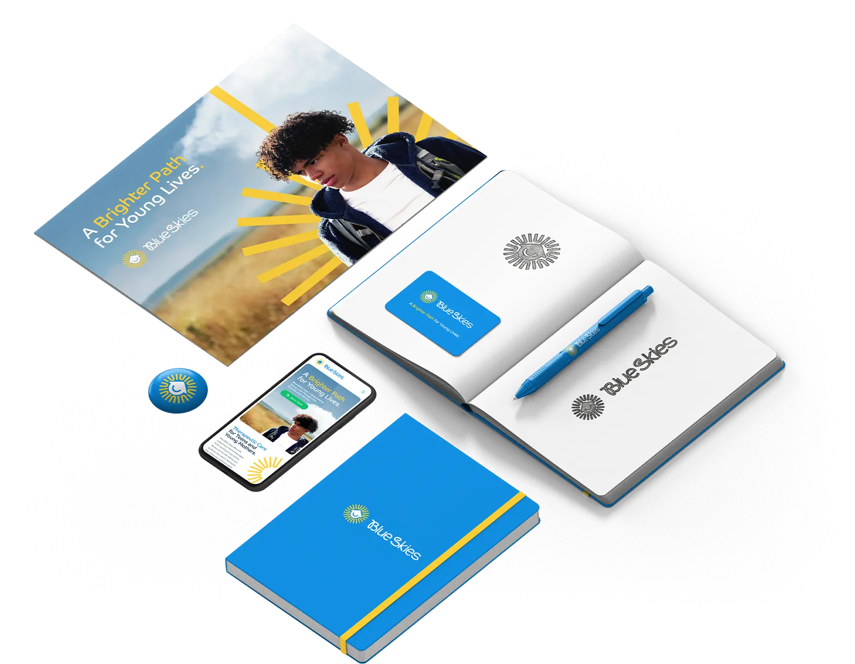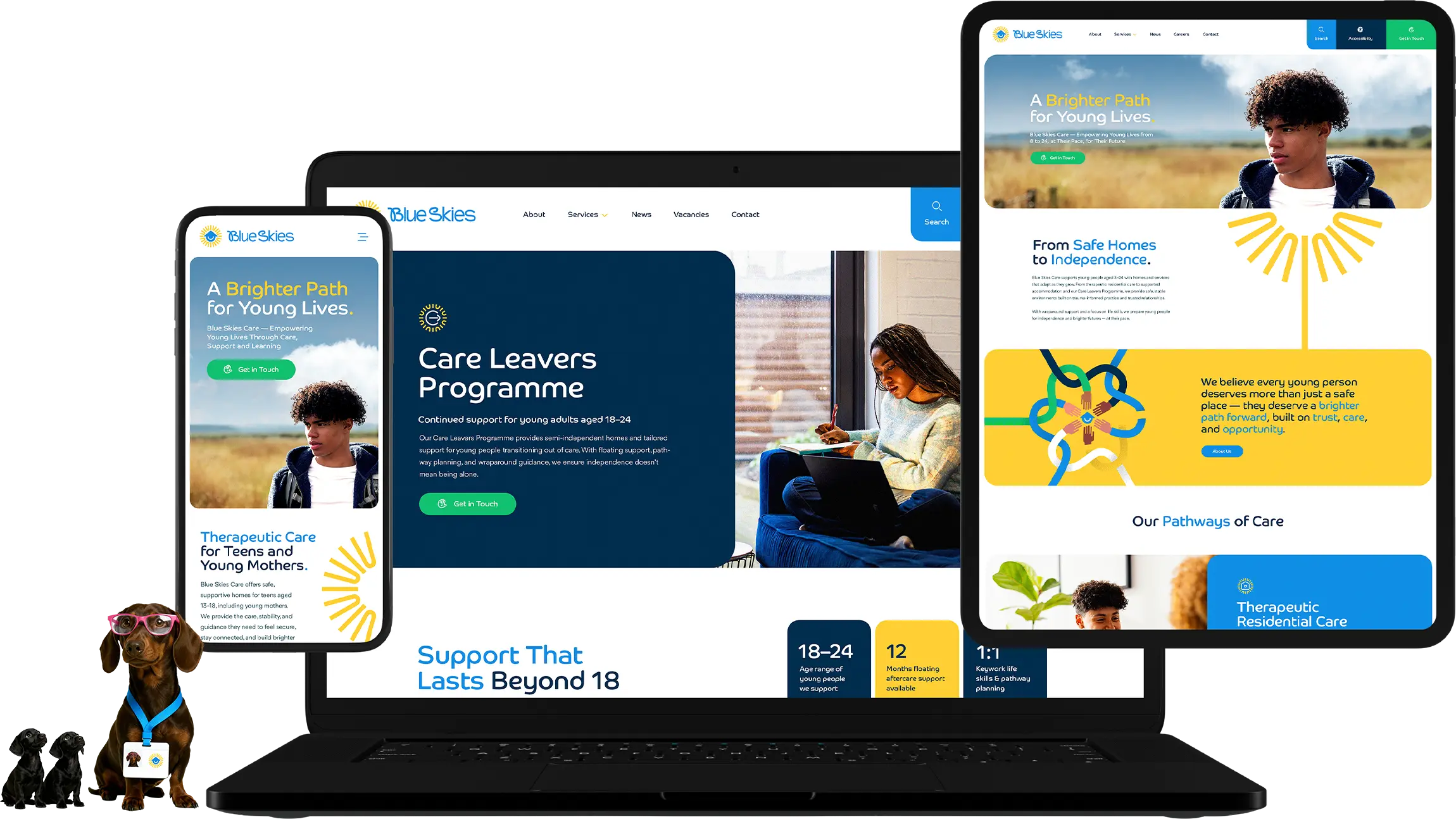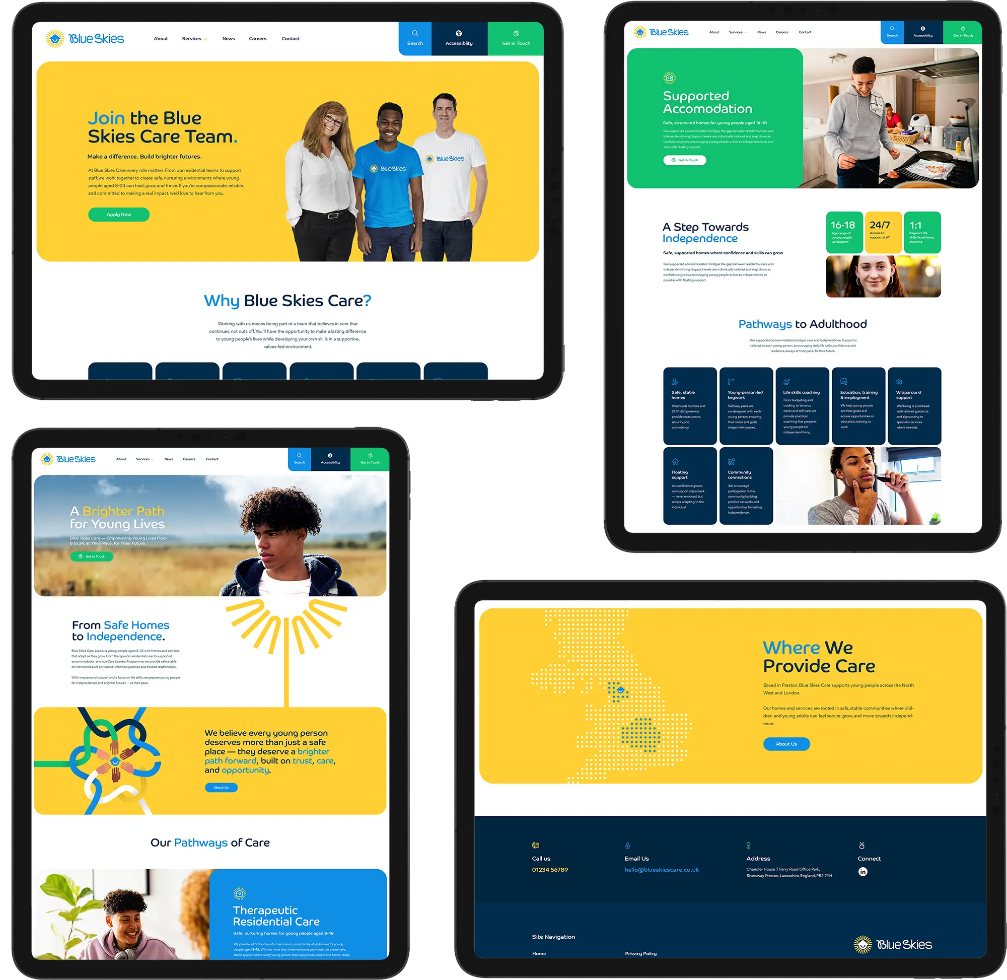 A bright, modern brand and website for Blue Skies Care, created to reflect a positive, supportive approach to residential care, supported living and ongoing youth support.