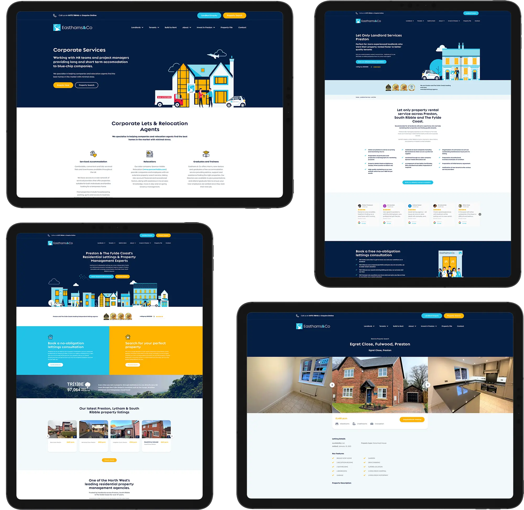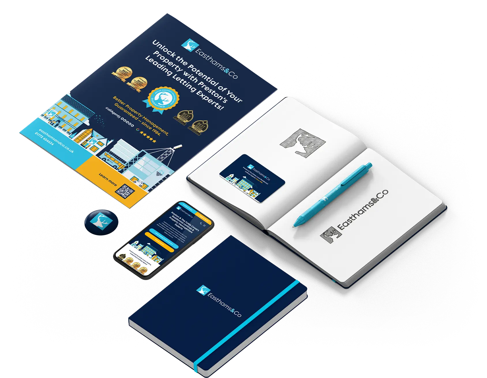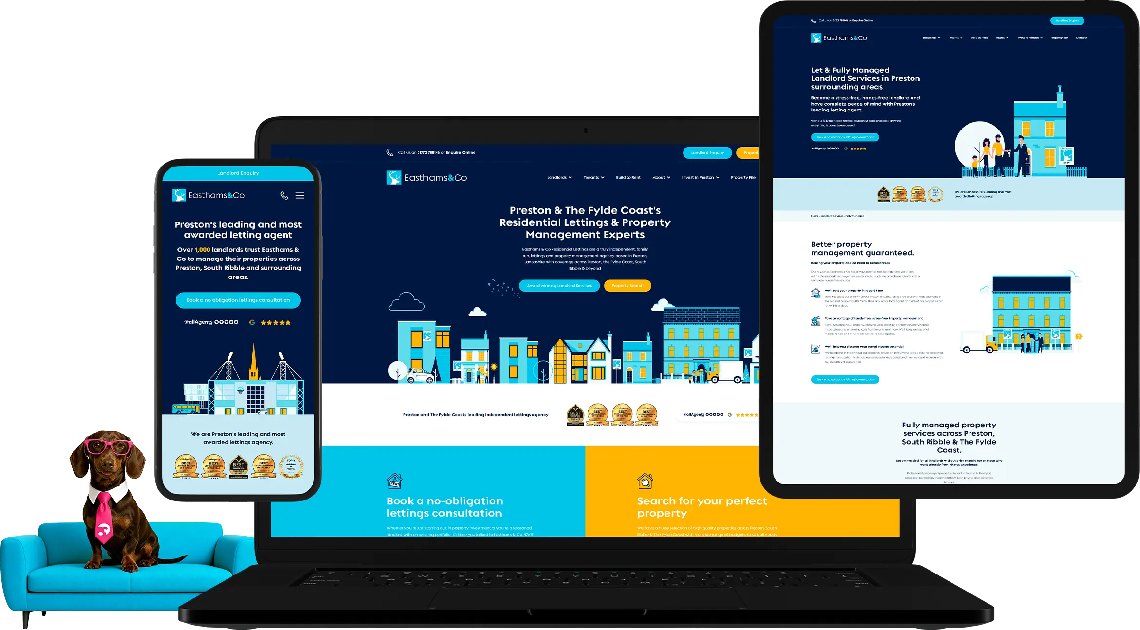 A distinctive brand refresh and website for Easthams Lettings, built around custom Preston and property-inspired illustrations to give the brand a unique, playful digital identity.