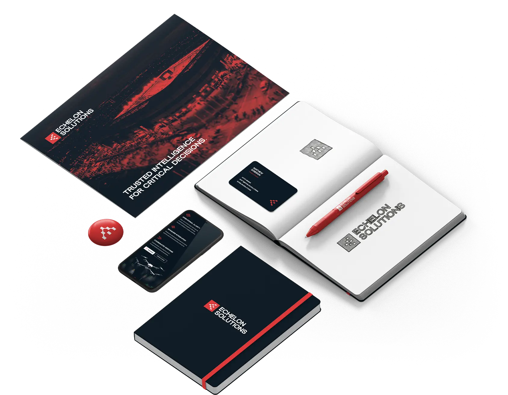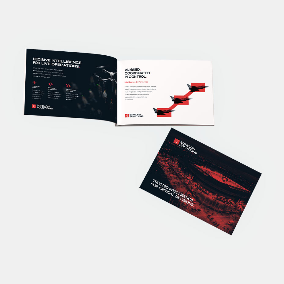 A sharp, modern identity for Echelon Solutions, built around the logic of echelon formations. The brand avoids typical surveillance or security clichΓ©s, instead focusing on a structured, confident look that feels precise, coordinated and trusted in high-stakes environments.
