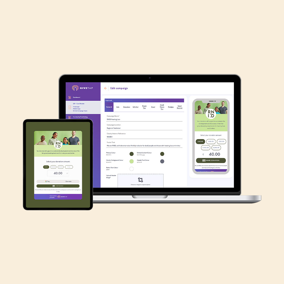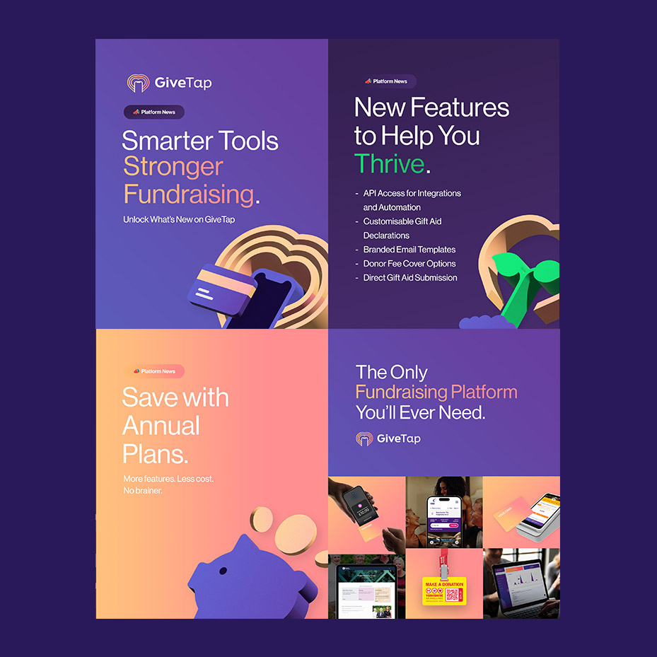 A long-term partnership with GiveTap, working across brand, digital and print to build a cashless fundraising platform used by charities nationwide.