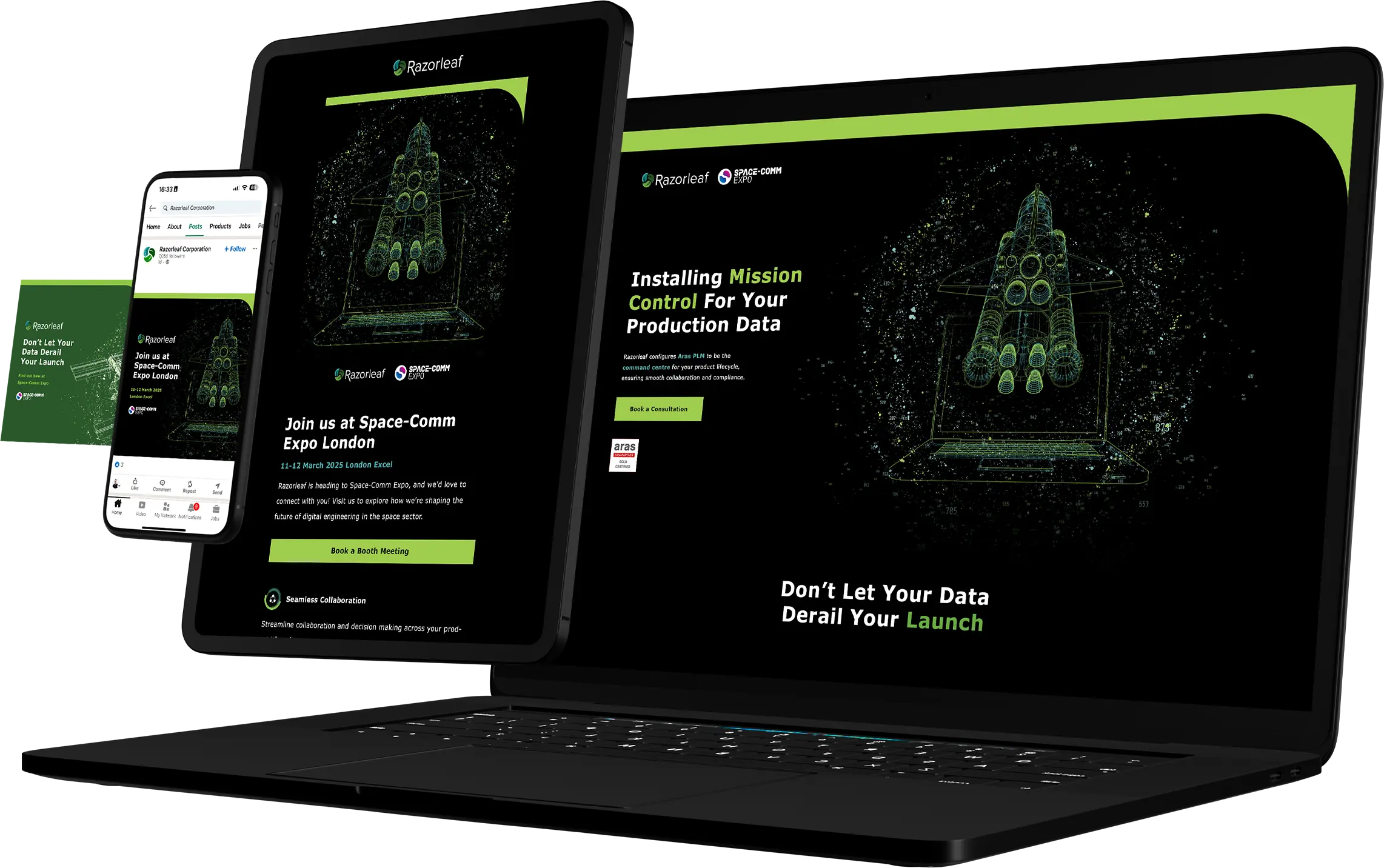 Creative support for Razorleafโs presence at Space-Comm Expo โ delivering a confident exhibition stand and supporting assets that help a complex digital engineering and PLM consultancy communicate clearly in a space-industry environment.