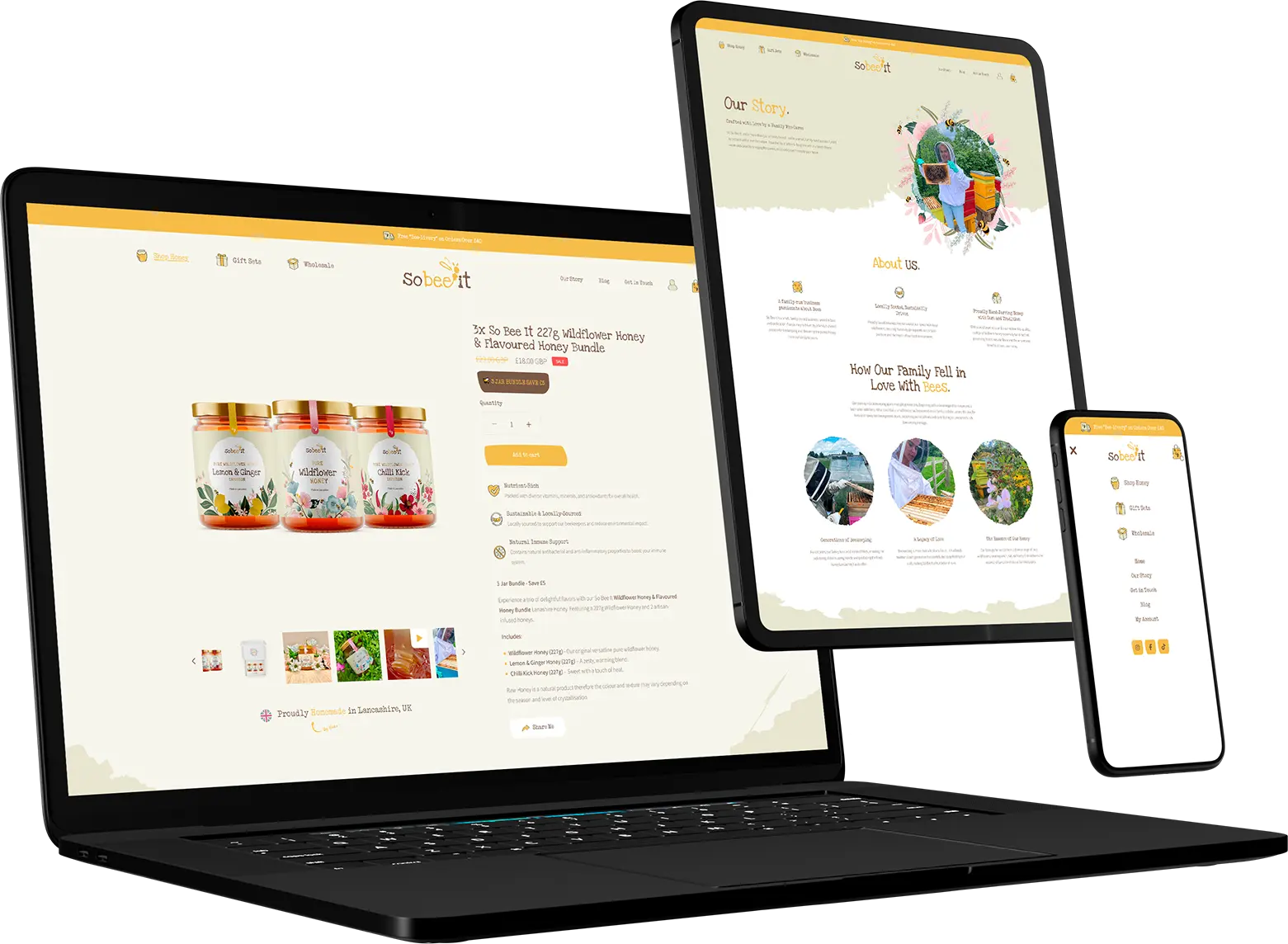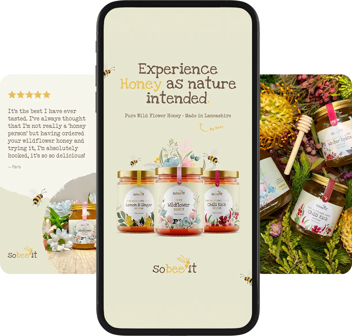 An authentic, feel-good brand rooted in nature โ crafted to help Lancashire Honey Company So Bee It stand out on shelves, online and in local hearts.
