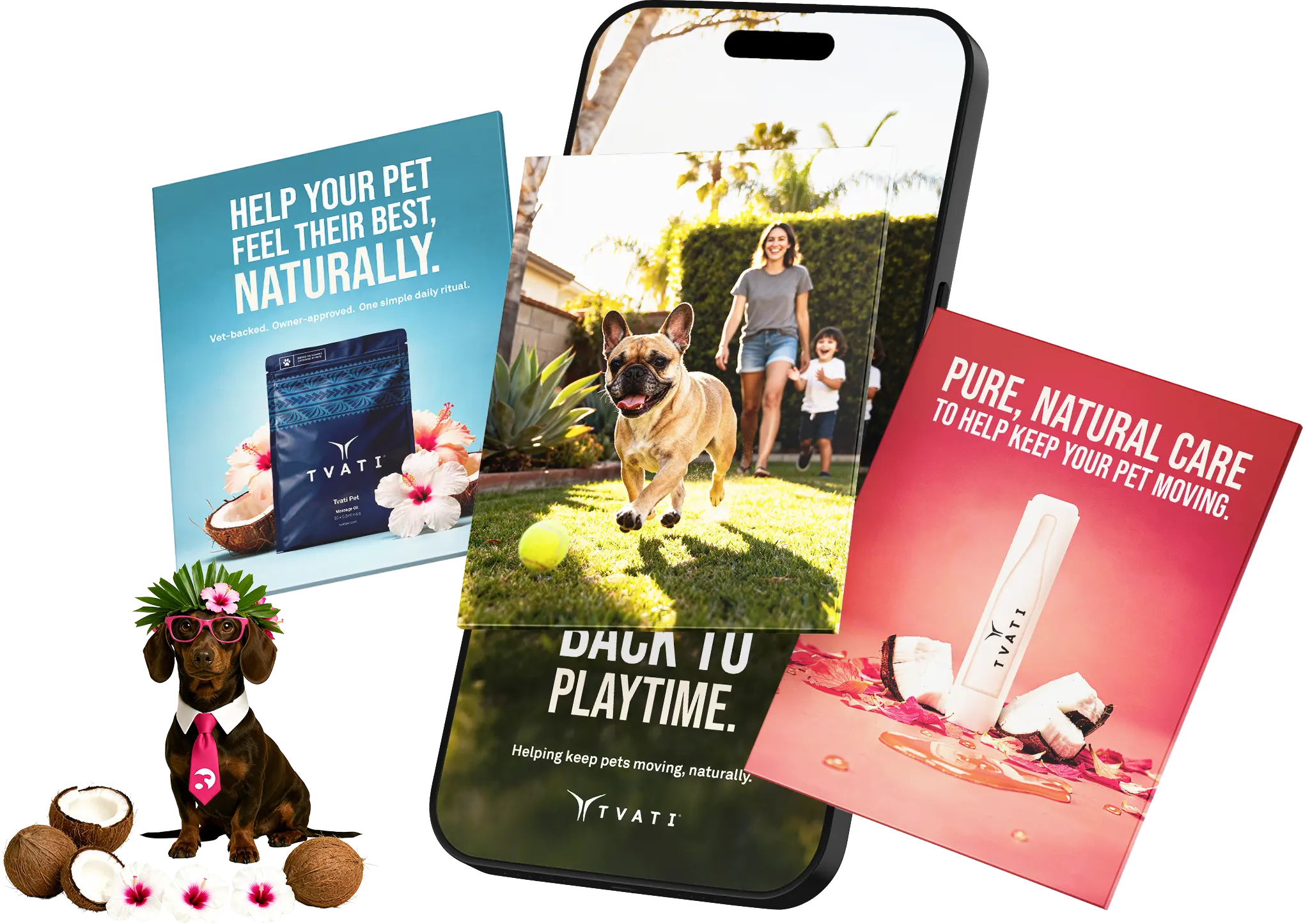 Creative direction and virtual photoshoots for Tvati Pet, producing scroll-stopping lifestyle visuals and on-brand content that bring their all-natural supplement to life. A playful, natural approach to pet health that feels anything but stock.