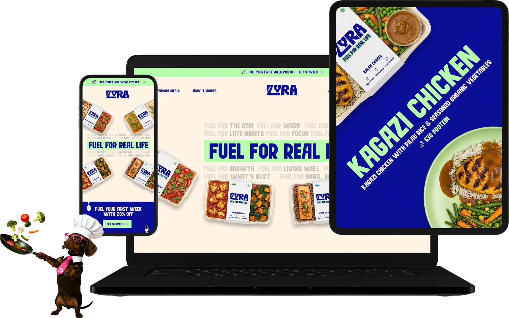 A full brand and packaging project for Zyra Foods, delivering a bold visual identity, premium ready-meal packaging and supporting marketing assets that position Zyra as a fresh, modern food brand built for real life.